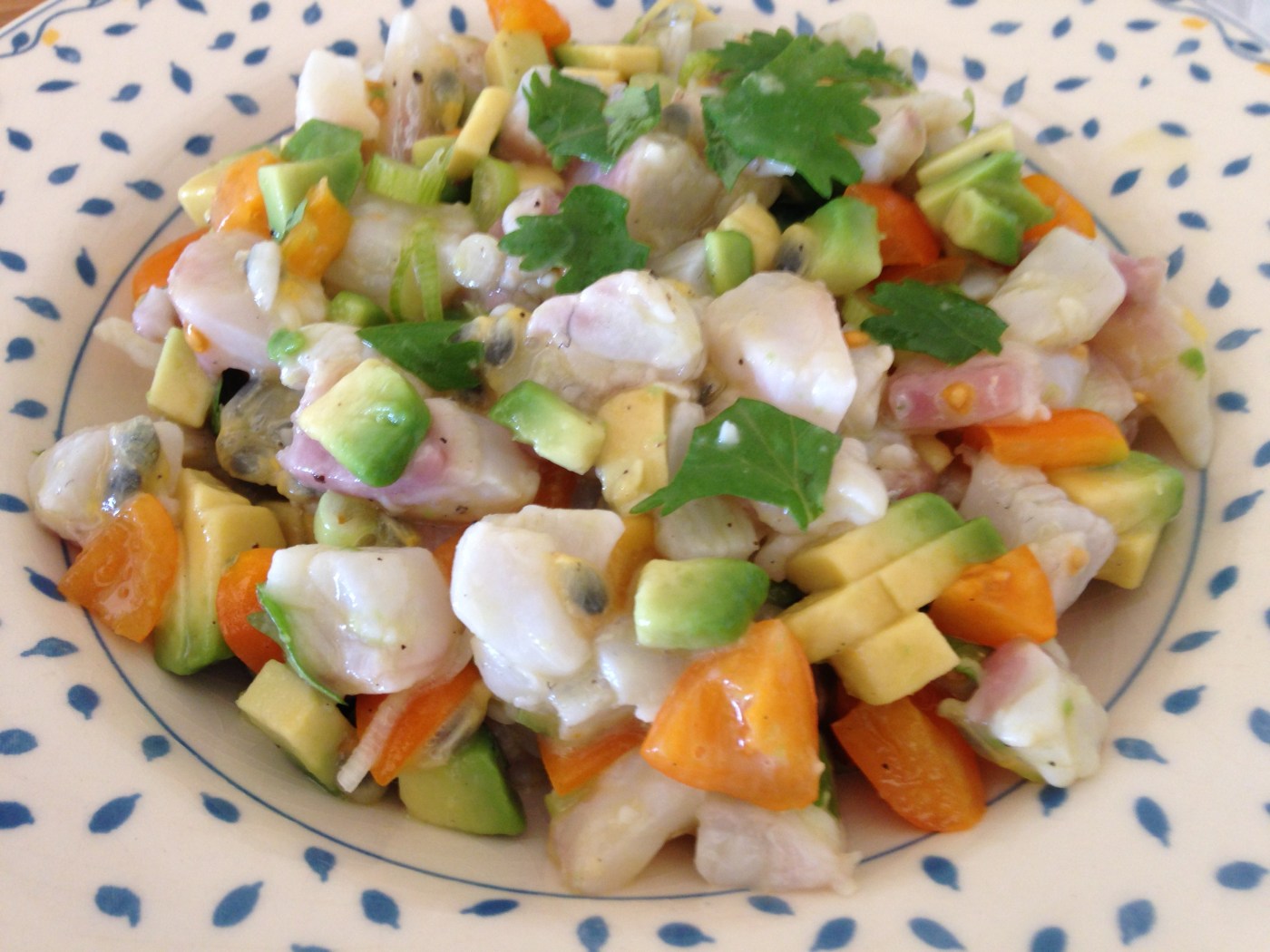 Coupez le poissons en dés (plus les dés sont petits, plus le poissons va « cuire » avec le citron. Arrosez le poisson du jus de citron vert et ajoutez les zestes si vous aimez. Coupez l’avocat, les cébettes, les tomates, ajoutez les au poisson, ajoutez la pulpe du fruit de la passion, mélanger le tout, saler et poivrer à votre goût. Décorer avec des bruns de coriandre.