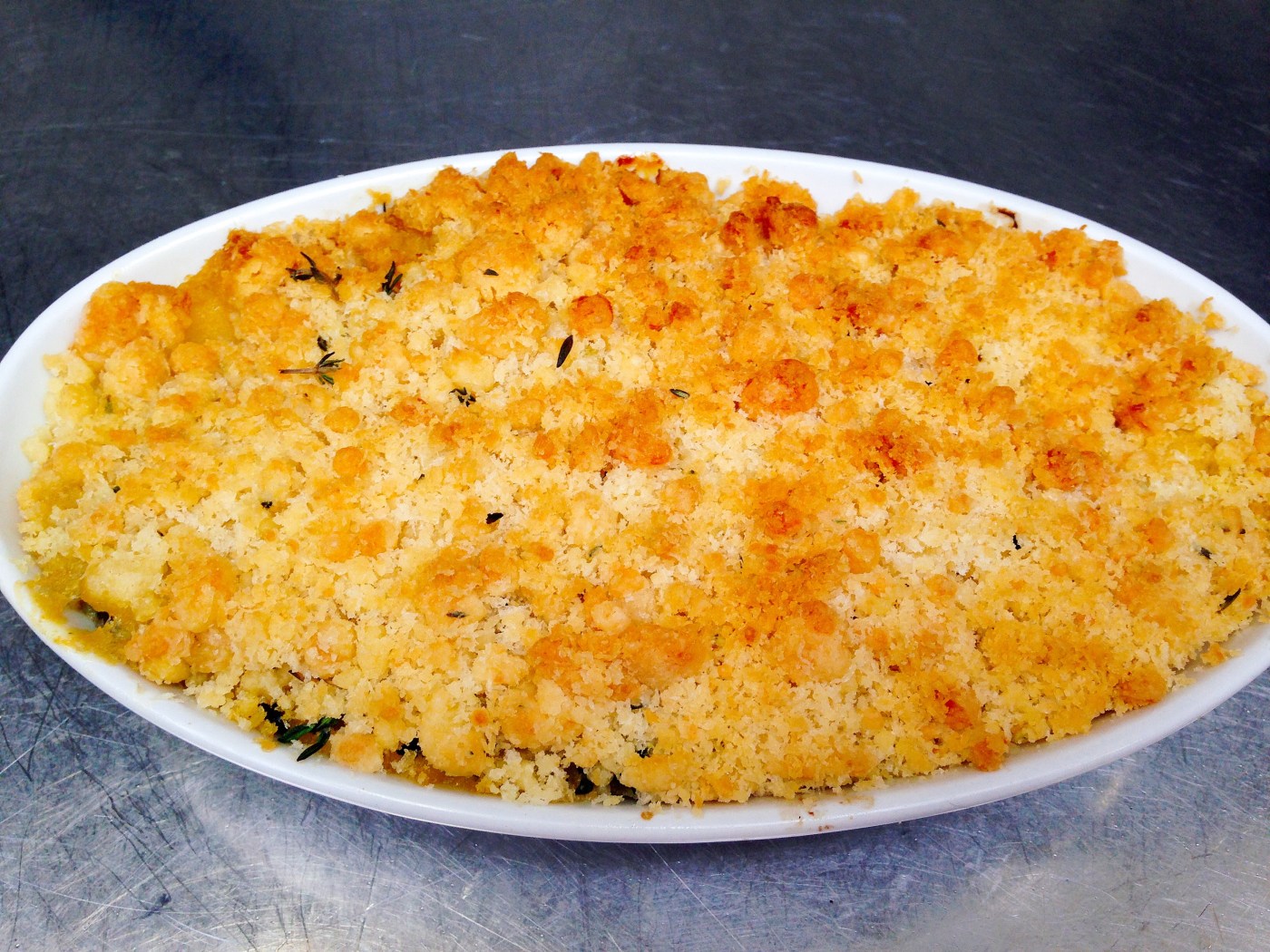 On prépare pendant ce temps là la pâte à crumble : dans un saladier, mélanger du bout des doigts la farine, le beurre demi-sel coupé en petit morceaux, le parmesan fraichement râpé et qq feuilles de thym (perso je fais cette étape au robot : qq secondes seulement sinon on risque d’obtenir une pâte à tarte !), ajouter ensuite la chapelure. L’ensemble doit être sableux avec qq grumeaux.