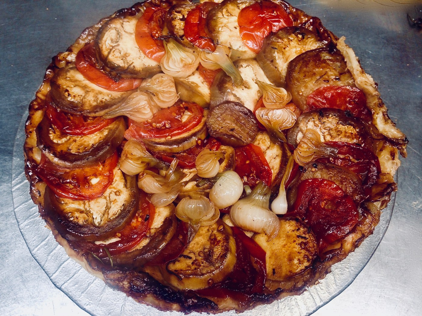 Verser le caramel sur le fond de tarte en réservant une petite quantité pour la finition. Disposer les tomates et les aubergines sur ce caramel en les faisant se chevaucher, intercaler les oignons nouveaux et parsemer de thym, disposer une 2ème couche de légumes (faire en sorte de recouvrir le tout par des aubergines), parsemer de thym, et verser le reste de caramel sur les légumes (j’étale avec un pinceau).