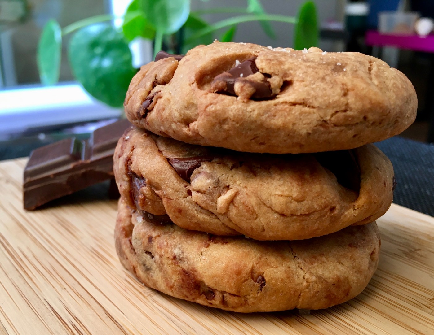 Je suis fane de l’association bananes – beurre de cacahuète – chocolat ! J’ai travaillé il y a quelques semaines sur un cake bananes, beurre de cacahuète et chocolat, et je vous propose aujourd’hui une nouvelle création : des cookies banane, beurre de cacahuète et chocolat. Ultra moelleux, « chewy », ultra gourmands et en plus vegans (pas exprès) !!