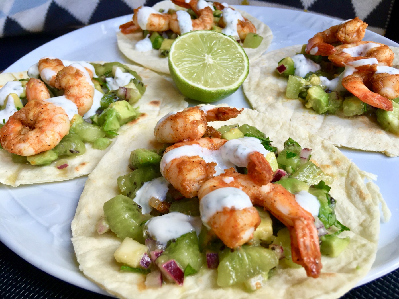 Je vous propose donc des tacos aux crevettes, salsa de kiwis (pour profiter des derniers kiwis de la saison, pas forcément super sucrés ce qui n’est pas plus mal) et une sauce yaourt à la menthe.