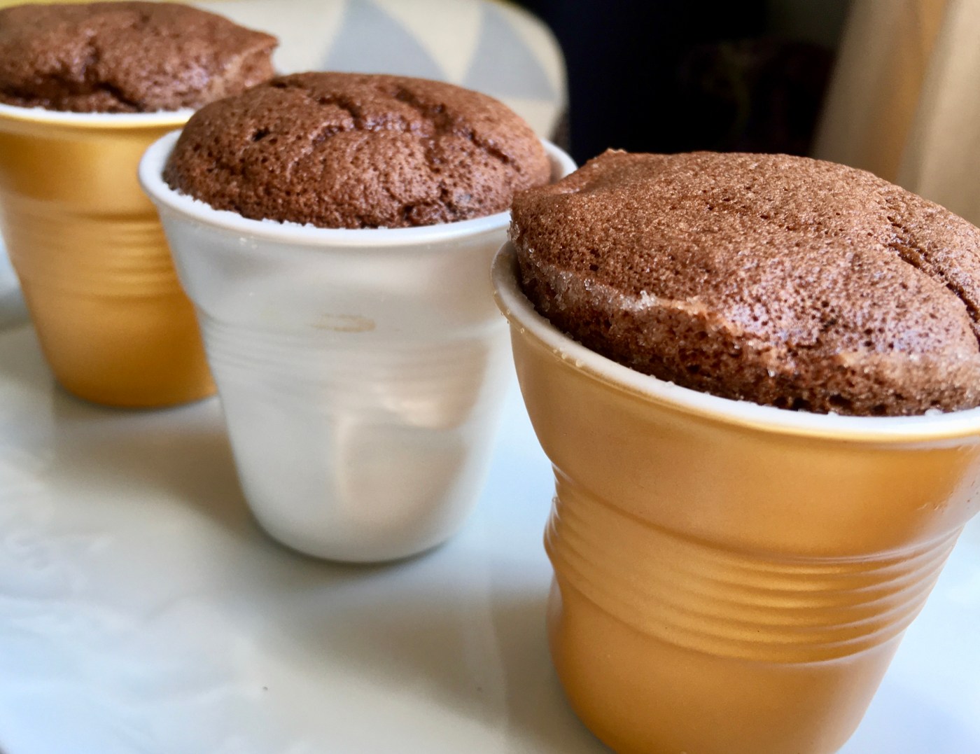 - Mettre au four pour 12 minutes ou un peu plus si vous voyez que les soufflés continuent de monter (ne surtout pas ouvrir la porte du four pendant la cuisson).