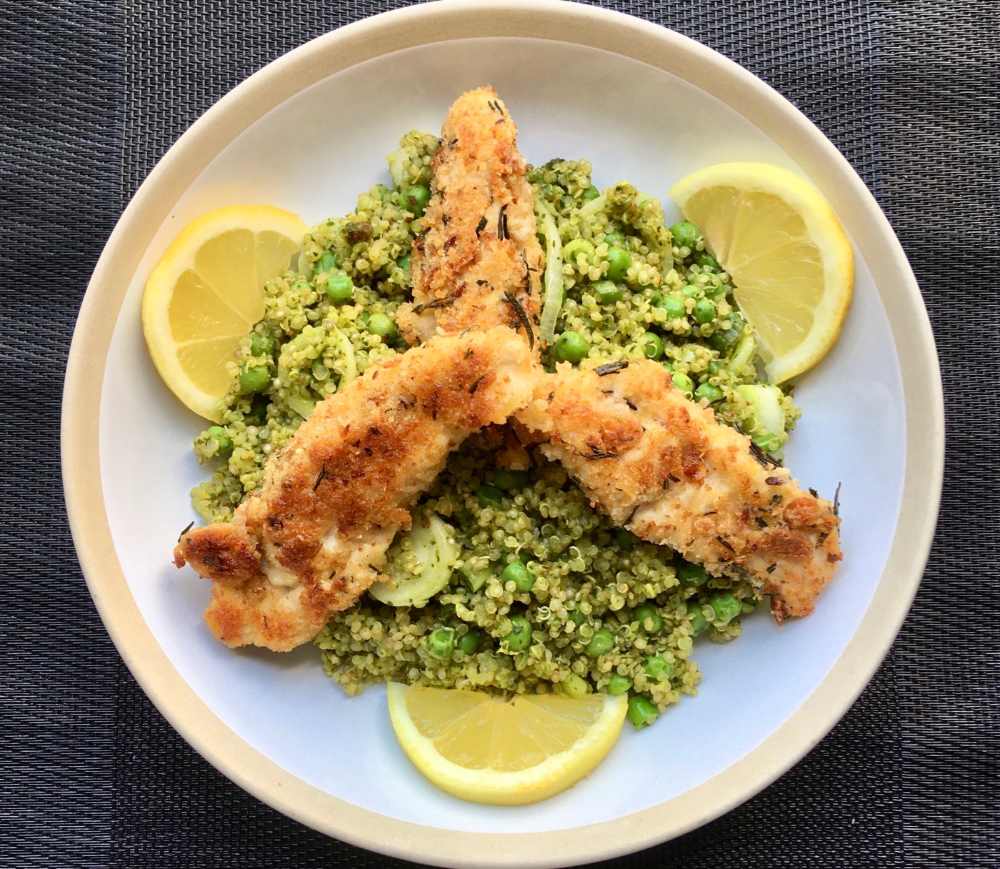 J’adore le poulet croustillant ! C’est si simple à réaliser et cela rend n’importe quel plat super gourmand. Je vous en avais déjà parlé avec ma salade César au poulet. Je vous le propose cette fois-ci dans un plat chaud avec du quinoa, du pesto, du citron et des légumes de printemps : rien de plus facile !