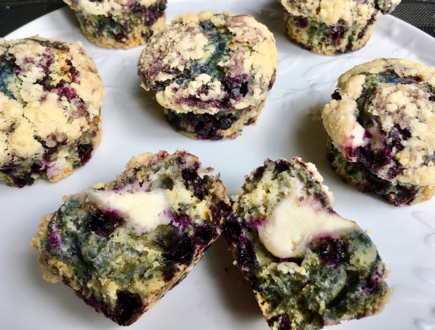 Des muffins à tomber !! Très moelleux, pleins de myrtilles, avec un coeur de cheesecake et un petit crumble sur le dessus. C’est un peu plus de travail que des muffins classiques mais cela en vaut vraiment la peine !