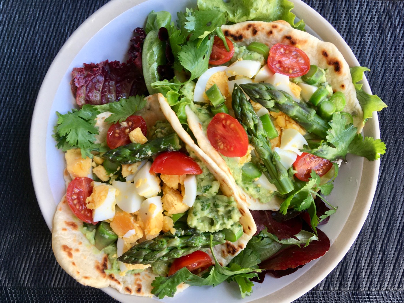 - Monter vos sandwichs : étaler une grosse cuillère à soupe de guacamole sur chaque flatbread, ajouter les rondelles d’asperges, l’oignon rouge, les morceaux d’oeufs, les tomates cerises et les pointes d’asperges.