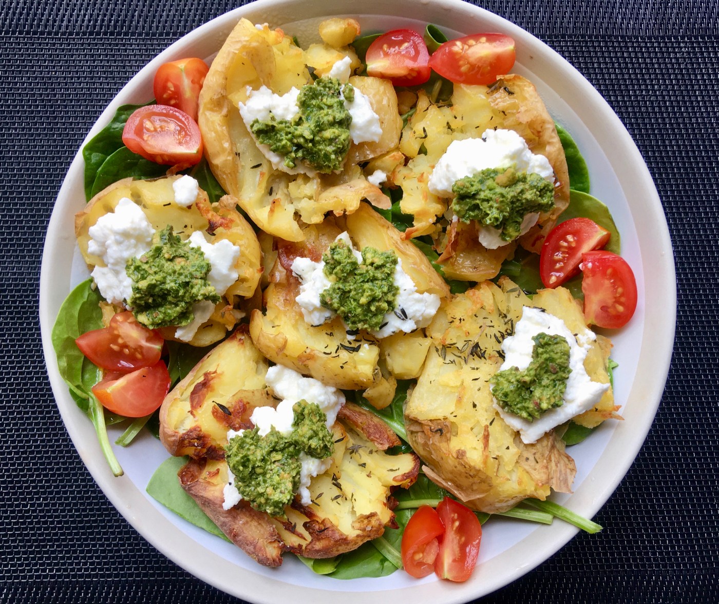 Une nouvelle idée de brunch originale et simplissime : des pommes de terre écrasées cuites au four et servies avec une brousse bien crémeuse (ou de la ricotta, burrata…) et un petit pesto de basilic aux pistaches (ou tout autre pesto / sauce qui vous fait plaisir). On peut également les servir natures, en accompagnement d’une viande ou volaille : originalité et succès garantis !