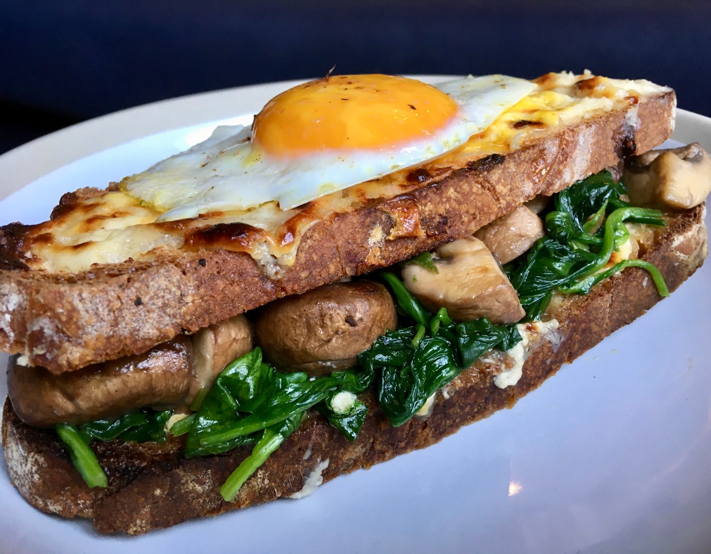 - Garnir 4 tranches de pain avec les épinards puis les champignons, déposer un oeuf au plat sur chacune des 4 autres tranches. Assembler les croques et servir aussitôt avec une salade par exemple.