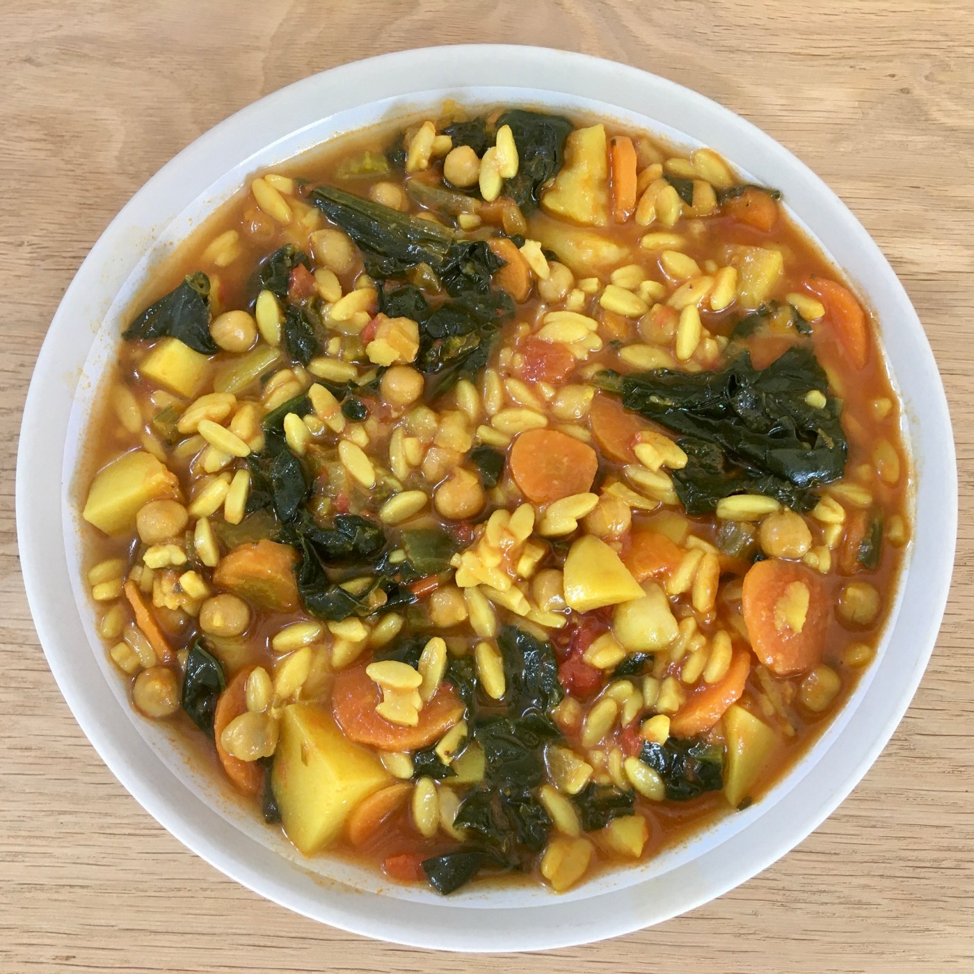 Pour les légumes, une base : oignons, carottes, pommes de terres, céleri puis vous pouvez ajouter des champignons, des épinards, des poireaux par exemple selon la saison et les envies. J’ajoute des petites pâtes ou du riz pour en faire un plat complet.