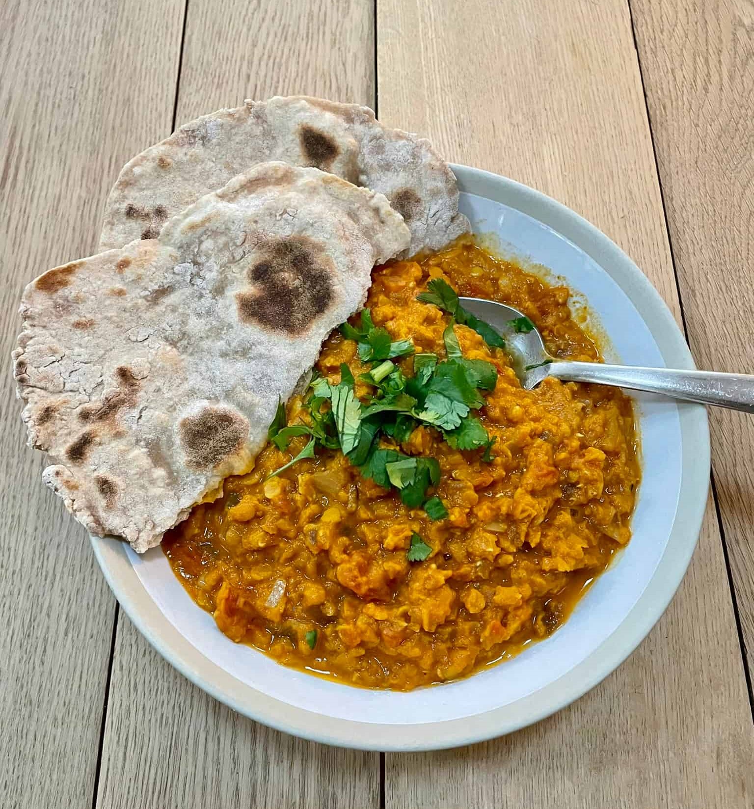 Pour accompagner ce dahl, je vous propose une recette de naans express vraiment excellente qui n’a rien à envier au naan traditionnel.