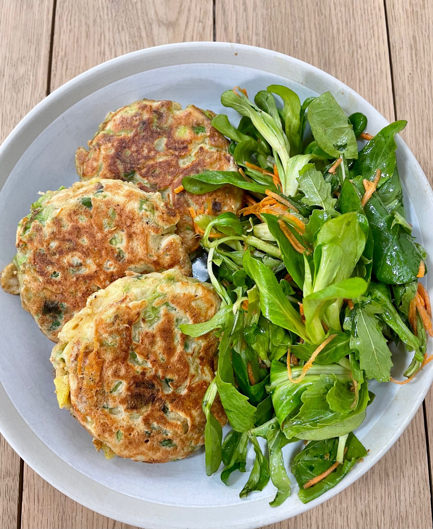Servir les galettes chaudes ou tièdes avec une salade, des crudités. On peut aussi les servir plus petites à l’apéritif avec une petite sauce au yaourt et aux herbes 🙂