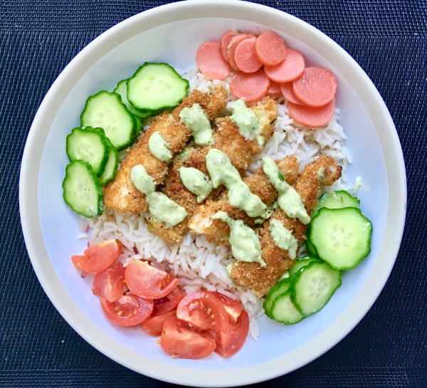« Bowl » de poisson pané et sauce crémeuse à l’avocat