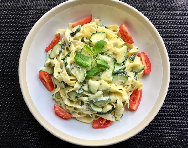 Tagliatelles aux courgettes, mascarpone, menthe et basilic